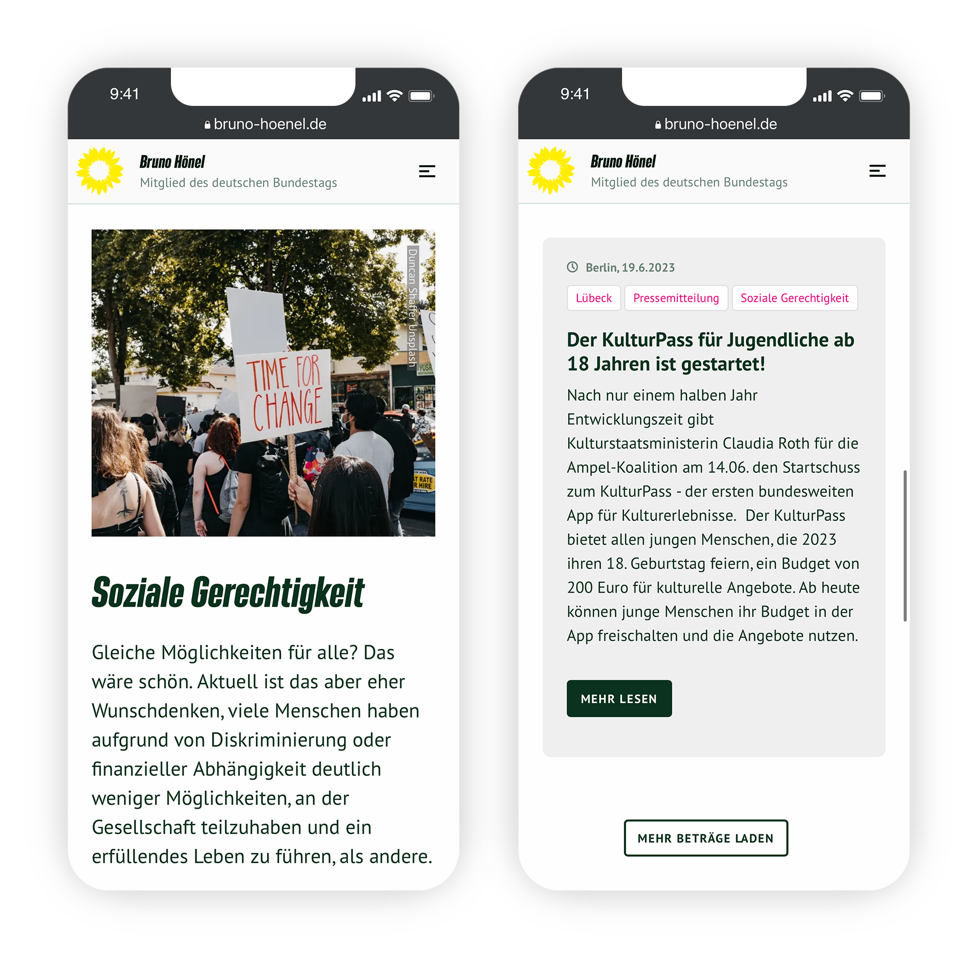 Zunächst konzipierte unser professionelles Webdesign das Projekt als Headless-CMS-Architektur mit einem modernen Workflow in React und mit einem Drop-down-Menü. Hier kann das Hönel-Team die Inhalte später selbst einpflegen. In dem animierten Vita-Modul erfahren die Besucher viel über den Abgeordneten, seinen Werdegang als Politiker und Mensch. Das Wichtigste: Hier spricht nicht irgendwer über Bruno Hönel, sondern er über sich.