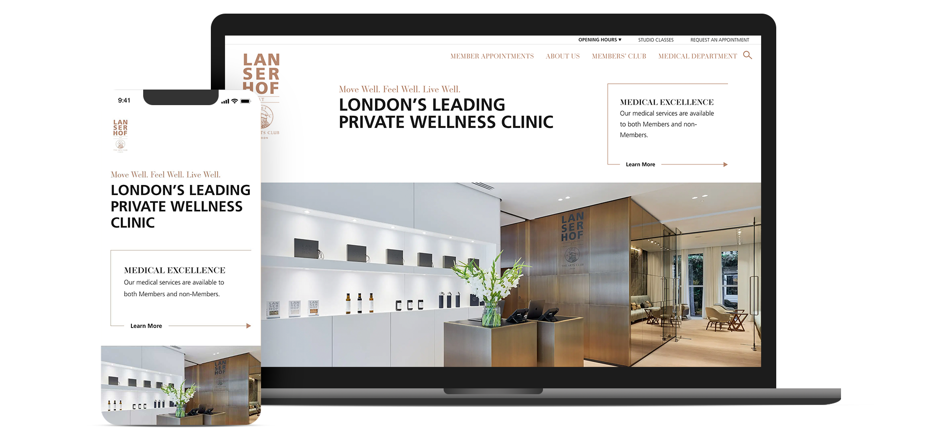 Um das luxuriöse Angebot perfekt zu präsentieren, hat sich unsere Digitalagentur einiges einfallen lassen. Zunächst entwickelten unsere Full-Stack-Designer und UI-Designer ein Mock-up mit einem dynamischen dreigeteilten Mouseover-Header. In diesem Triptychon werden die drei Hauptkategorien Wellness und Fitness, Diagnostik und Behandlung sowie Biomechanik und Physiologie mit ausdrucksstarken Produktfotografien und überzeugenden Imagefilmen angezeigt.