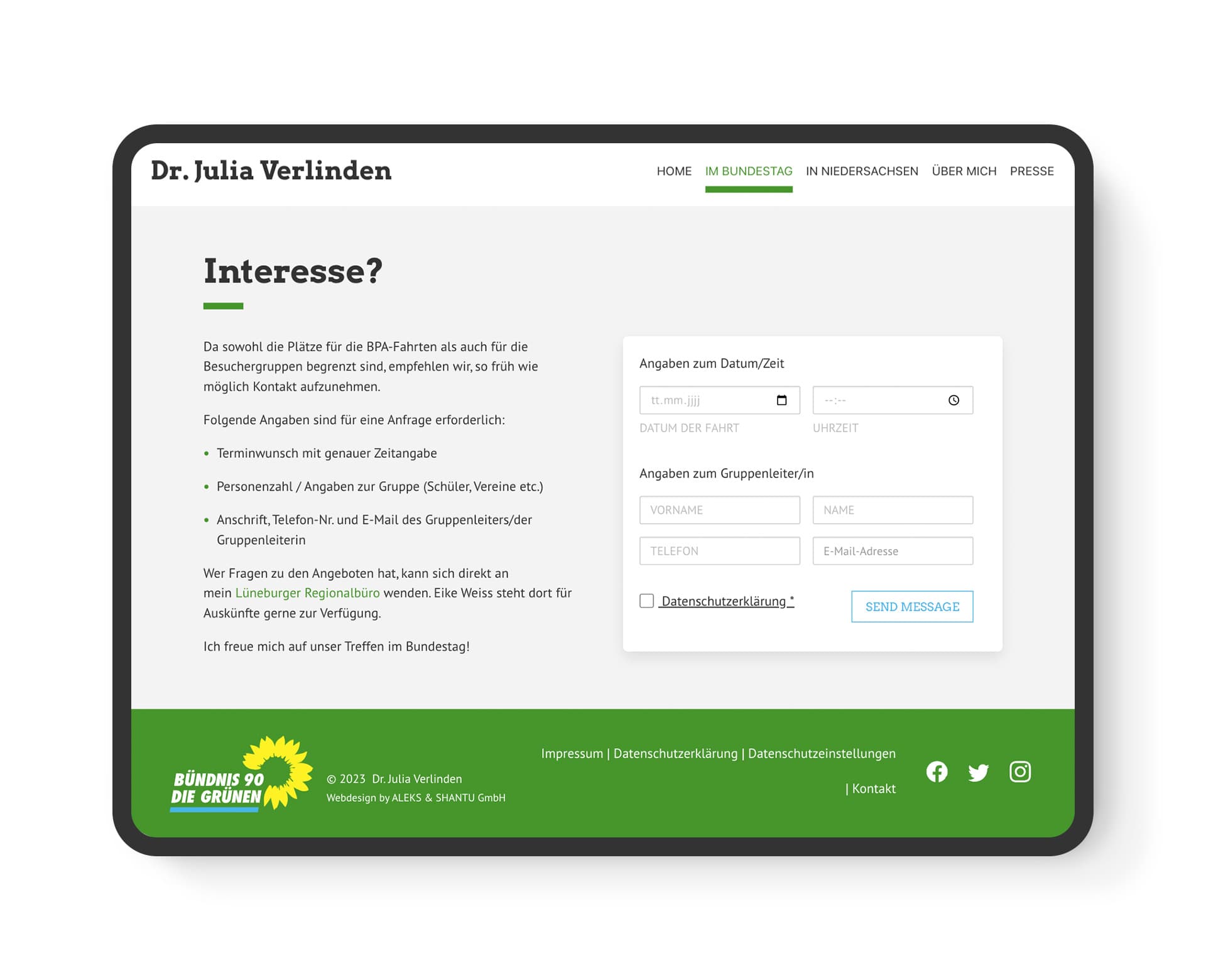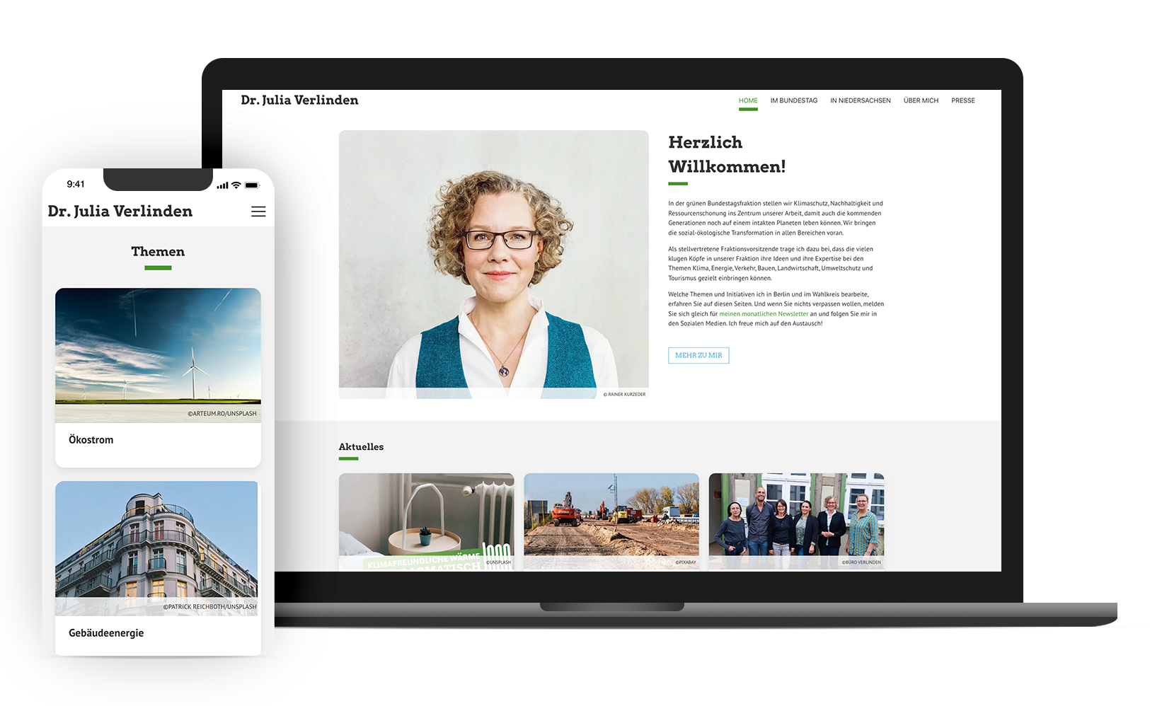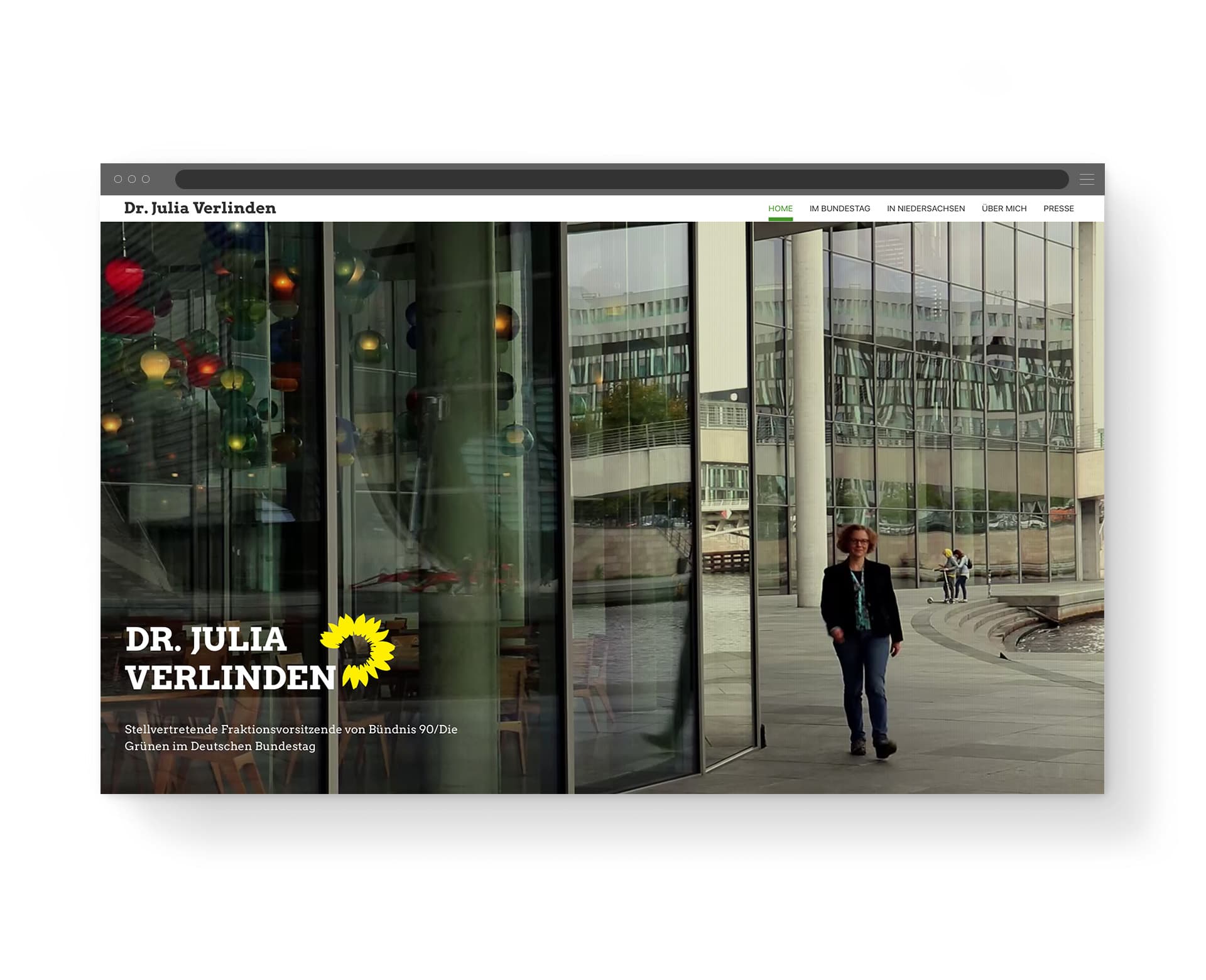 Das Highlight der Startseite ist das eingebundene Fullscreen-Headervideo von Julia Verlinden, mit dem unser Developer eine erste Verbindung zu den Besuchern herstellt. Unsere Expertise in modularer Webentwicklung ermöglichte es, weitere Lösungen zu entwickeln. Durch kreative Scroll-Animationen entstanden bspw. flüssige Übergänge; die Integration der Social-Media-Feeds bietet einen direkten Zugang zur Politikerin.